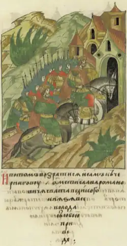 ![]() Oleg Svyatoslavich with the captive Mstislav III of Kiev,miniature from the Illustrated Chronicle of Ivan the Terrible (16th century) | |