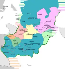 2. ^ In 12th- and 13th-century Kievan Rus', the four dominant princely clans were the Olgovichi of Chernigov, the Rostislavichi of Smolensk, the Iziaslavichi of Volhynia (based in modern Volodymyr in Volyn'), and the Yurievichi of Suzdalia (alias the Vsevolodichi of Vladimir on the Klyazma).[1] 'Three of these clan founders – Vsevolod, Rostislav, and Iziaslav – were the grandsons of Volodimer Monomakh. The outlier from this set is Oleg, who was instead a cousin of Volodimer Monomakh.'[2]