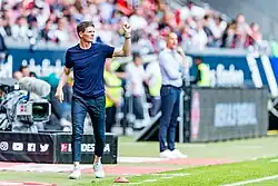 The following season, Glasner led Frankfurt to second place in the Champions League group stage against Tottenham, Sporting and Marseille, but lost in the round of 16 against the subsequent Italian champions Napoli.[16] Though they were fourth at the halfway point, Frankfurt only finished seventh, winning two of their last three matches to secure qualification for the Europa Conference League.[16] They also reached the DFB-Pokal final against RB Leipzig, but lost 2–0.[17] Following a poor second half of the league season, Glasner left Frankfurt at the end of the 2022–23 season, one year earlier than his original contract.[16] Dino Toppmöller was his successor.