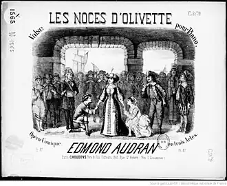 Les noces d'Olivette is an opéra comique in three acts composed by Edmond Audran, with a libretto by Alfred Duru and Henri Charles Chivot. The farcical romance story concerns Olivette, who loves Valentine (who is also loved by a Countess) but is engaged to a sea captain, who she refuses to marry. Valentine secretly weds Olivette, the captain declares that Olivette is his rightful bride, Valentine is arrested, Olivette is disowned, but eventually her marriage to Valentine is upheld.
