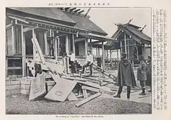 Alarmed by the popularity of Oomoto, the Imperial Japanese government, which promoted kokutai, State Shinto, and reverence for the emperor, condemned the sect for worshipping Ookunitokotachi above Amaterasu, the sun goddess from whom the Emperor of Japan claimed descent.[8] This led to two major incidents when Oomoto was persecuted under the lèse-majesté law, the Newspaper Censorship Law, and the Public Security Preservation Law of 1925. In 1921, the first Oomoto Incident (大本事件, Ōmoto jiken) resulted in the Oomoto headquarters being destroyed, and Onisaburo and a few of his followers were imprisoned.[4]