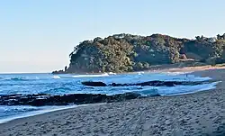 The area was originally named Whitipirorua by Māori.[11] The first known settlers of the area were the Ngāti Hei. They were supplanted by Ngāti Hako in the mid 17th century, but Ngā Puhi raids during the Musket Wars of the early 19th century left the area without a permanent population.[12] By a variety of means the land was acquired by the government and sold to settlers.[13] Archaeological evidence suggests that the area was first settled in the 1300s, with a pā located at the south of Onemana Beach.[14] The area was important for the production of stone tools made of matā (chert) and matā tūhua (obsidian).[14]