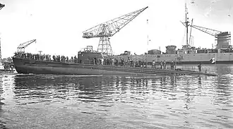 For surface running, the boats were powered by two diesel engines, each driving one propeller shaft with overall power of 675–750 hp (503–559 kW).[3] When submerged each propeller was driven by a 400-horsepower (298 kW) electric motor. They could reach 14 knots (26 km/h; 16 mph) on the surface and 7.5 knots (13.9 km/h; 8.6 mph) underwater. On the surface, the Perla class had a range of 5,200 nautical miles (9,600 km; 6,000 mi) at 8 knots (15 km/h; 9.2 mph), submerged, they had a range of 74 nmi (137 km; 85 mi) at 4 knots (7.4 km/h; 4.6 mph).[3][4]
