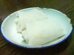 A scallion pancake is a Chinese pancake or unleavened flatbread prepared using scallion as a primary ingredient.[22] It is typically prepared using a dough, although some are prepared from a batter.[22] The scallion pancake is a traditional food in Shanghai, China, and is a common dish throughout the country.[22] In China, fresh scallions are typically used in the dish's preparation.[22] The scallion may be fried before it is added to the dough.[22]