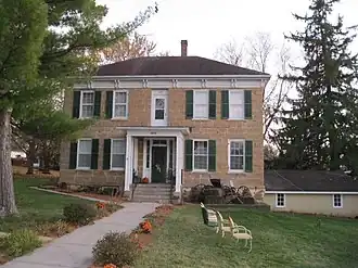 In 1863 Onon built the house that is the subject of this article, with a T-shaped floor plan. The front of the house is the top of the T, a two-story main block with walls of coursed ashlar limestone blocks fixed with raised mortar joints. Windows are symmetric around the centered front door. At the top of the wall is a broad frieze board, and above that a hip roof. The overall style is Greek Revival, except for fine double brackets under the eaves, which are drawn from Italianate style. Behind the main block the stem of the T is a 1.5-story wing. On each side the roof extends to shelter a veranda. Inside, the house has varnished narrow-board floors and plaster walls and ceilings.[3]