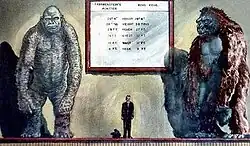 Early drafts of the script were sent back with notes from the studio asking that the monster antics be made as "funny as possible".[38] This comical approach was embraced by Tsuburaya, who wanted to appeal to children's sensibilities and broaden the genre's audience.[39] Much of the monster battle was filmed to contain a great deal of humor but the approach was not favoured by most of the effects crew, who "couldn't believe" some of the things Tsuburaya asked them to do, such as Kong and Godzilla volleying a giant boulder back and forth. With the exception of the next film, Mothra vs. Godzilla, this film began the trend to portray Godzilla and the monsters with more and more anthropomorphism as the series progressed, to appeal more to younger children. Ishirō Honda was not a fan of the dumbing down of the monsters.[34] Years later, Honda stated in an interview. "I don't think a monster should ever be a comical character," and "The public is more entertained when the great King Kong strikes fear into the hearts of the little characters."[40] Honda also believed that if Godzilla acted like a human, it showed off the fact that it was a man in a suit.[41] The decision was also taken to shoot the film in a (2.35:1) scope ratio (TohoScope) and to film in color (Eastman Color), marking both monsters' first widescreen and color portrayals.[42]