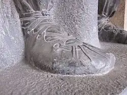 Trajan's Column in Rome features Dacians wearing this type of leather shoes. Archeological findings show that the local population was hunting wild game: foxes, deer, badgers, wolves, bears, whose skins were later manufactured. The nobility would wear game skin shoes, the poorer ones would wear calf or swine skin.[3] According to Wilkes, opanci were originally a leather moccasin worn by paleo-Balkan peoples as Illyrians, Dacians, Thracians, etc., and later adopted by Slavs.[4][5] In the past the traditional shoes were handcrafted out of leather processed at home. The piece of leather had to be larger than the sole, with holes on the side so that a thin string of leather can be filled in and it wraps the piece of leather around the foot, giving it the form of some footwear. The puckered form gave it a sharp tip. They would be worn over wool stockings or white pieces of clothing. Nowadays they are often used as part of the traditional costume by folk dance groups and folk artists.[6]