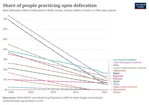 - ^ "Share of people practicing open defecation". Our World in Data. 6 January 2024. Archived from the original on 17 August 2024. Retrieved 16 August 2024.