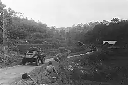 Dutch paratroopers from Korps Speciale Troepen[12][13] landed at Maguwo airfield, which was defended by 47 lightly armed Indonesian Air Force cadets who lacked anti-aircraft machine guns. In advance, dummies were landed by the Dutch to draw enemy fire which enabled Dutch fighter planes to strafe the defenders.[1] The skirmish lasted for 25 minutes ending with the Dutch taking over Maguwo; killing 128 republicans with no casualties.[14] Having secured the airfield perimeter by 06:45, the Dutch were able to land airborne troops in two successive waves and use Maguwo as an airhead for reinforcements from their main base in Semarang.[1] At 8:30 am, General Spoor gave a radio broadcast ordering his forces to cross the Van Mook line and capture Yogyakarta to "purge" the republic of "unreliable elements".[1]