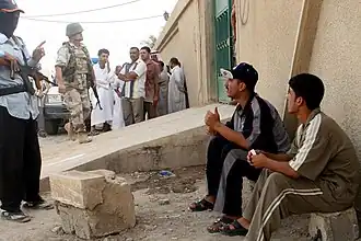 ![]() An Iraqi policeman talks with two Iraqi civilians as they wait in line to receive new identification cards at a police precinct in Fallujah on 30 June 2007. As part of Operation Alljah, Marines and Iraqi Security Forces sectioned the city into precincts and set up operational stations where Iraqi civilians come in to receive identification cards, food, reimbursements and a chance to join the neighborhood watch program. | |||||||