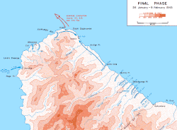 - ^ Frank, p. 572; Morison, pp. 343–344; Jersey, pp. 373–374, 381; Miller, pp. 341–342. Between 10 and 31 January the Americans lost 189 soldiers and Marines killed. Exact Japanese casualties in the Marmura and Bonegi River actions are unknown but Japanese records described their losses as "heavy". During this time, the Americans captured 105 Japanese soldiers, 240 machine guns, 42 field pieces, 10 antiaircraft guns, 9 antitank guns, 142 mortars, 323 rifles, 18 radios, 1 radar, 13 trucks, 6 tractors, and 1 staff car, besides a quantity of ammunition, land mines, flame throwers, and piles of documents (Miller p. 342).