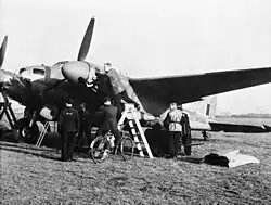 Following the Bostons, the pilots in the Mosquitos observed enemy aircraft approaching from the airfield. Squadron Leader D. Parry and Flight Lieutenant W. Blessing turned toward them.[42] They closed in a moment and soon were being fired upon. Banking and pushing throttles full on, they accelerated, the Focke-Wulf 190 having a similar top speed to the Mosquito.[43][a] Parry went flat out, keeping an eye on his pursuers; eluding his attackers, he was able to continue. Blessing was chased for ten minutes, got away but was too late to resume the mission and returned to base with his bombs.[44]