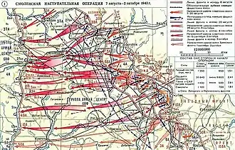 The second Smolensk operation (code naming "Suvorov";[5] 7 August – 2 October 1943) was a Soviet strategic offensive operation conducted by the Red Army as part of the Summer-Autumn Campaign of 1943. Staged almost simultaneously with the Lower Dnieper Offensive (13 August – 22 September), the offensive lasted two months and was led by General Andrei Yeremenko, commanding the Kalinin Front, and Vasily Sokolovsky, commanding the Western Front. Its goal was to clear the German presence from the Smolensk and Bryansk regions. Smolensk had been under German occupation since the first Battle of Smolensk in 1941.