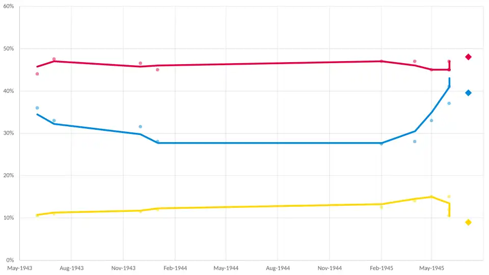 | Jun 1943 | Gallup | News Chronicle | 36% | 44% | 10.5% | 8% |