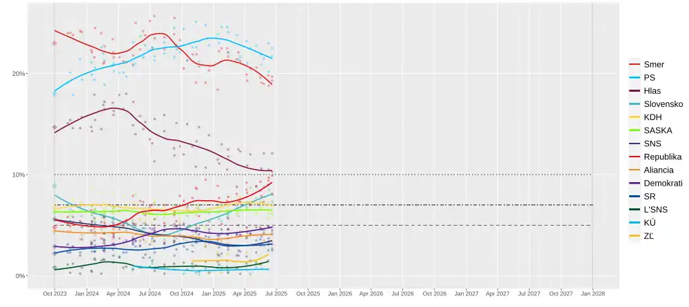 - ^ a b "Prieskum: Voľby by sa zrejme skončili patom, Hlas prestal klesať". Sme (in Slovak). 18 July 2025. Retrieved 18 July 2025.
