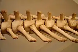 The skull and neck are not preserved, but the reconstruction of the nuchal ligament indicates the possession of a neck of medium length of roughly 5 m (16 ft).[3] Borsuk-Białynicka, in her 1977 description, noted the presence of eleven dorsal vertebrae. Gregory Paul in 2019, however, argued that the known part of the vertebral column actually includes the first cervical (neck vertebra), leaving only ten dorsals, typical of titanosaurs.[16] As in other titanosaurs, the back was quite flexible due to the lack of accessory vertebral joints (hyposphene-hypantrum articulations),[17] while the pelvic region was strengthened by an additional sixth hip vertebra.[3] The anterior vertebrae of the tail were opisthocoelous, which means they were convex on their anterior sides and concave on their back sides, forming ball-and-socket joints.[3] These opisthocoelous tail vertebrae lend Opisthocoelicaudia its name and serve to distinguish the genus from all other titanosaurs.[18] Other titanosaurs were usually characterised by strongly procoelous anterior tail vertebrae, which were concave on their anterior sides and convex on their back sides.[19] Another unique feature can be found in the back vertebrae, which show bifurcated spinous processes, resulting in a double row of bony projections along the top of the spine.[20] While unique in titanosaurs, this feature can be found in several other unrelated sauropods, including Diplodocus and Euhelopus, where it evolved independently.[21]