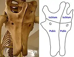 As in the hips of other titanosaurs, the ischium was relatively short, measuring only two-thirds the length of the pubis. The left and right ischium bones as well as the left and right pubis bones were ossified with each other over most of their length, closing the gap that in other sauropods is normally present between these bones.[18] The limbs were proportionally short, as seen in other titanosaurs.[22] The forelimbs measured 1.87 m (6.1 ft) in height in the nearly complete specimen, approximately two thirds the length of the hindlimbs, which were reconstructed at 2.46 m (8.1 ft) height.[3] As in other titanosaurs, the limbs were slightly spread outwards rather than standing vertically under the body,[23] while the forelimbs were more flexible and mobile compared to other sauropods.[22]
