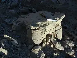 By 2017, sauropod fossils had been recovered from a total of 32 localities within the Nemegt Formation, and possibly belong to either Opisthocoelicaudia or Nemegtosaurus. At least two finds from the Nemegt locality – a fragmentary tail (MPD 100/406) and a pair of claws – show features diagnostic for Opisthocoelicaudia and can be referred to the latter.[8][7] Field crews led by Philip Currie attempted to relocate the Opisthocoelicaudia holotype quarry in 2006 and 2008, but became successful only in 2009 thanks to additional data provided by Gradziński.[7] Although a prospection for additional bone material was not possible as the quarry had been filled by windblown sand, the quarry could be determined to fall within the lower portion of the Nemegt Formation.[7]