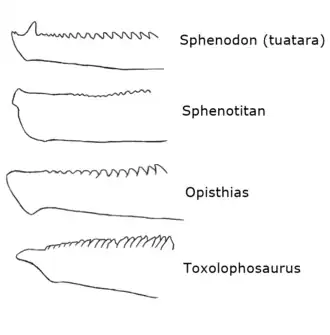 Like other sphenodonts, opisthodonts had acrodont teeth which grew directly from the bone. They had one row of teeth on the lower jaw and two rows on the roof of the mouth. When processing food, their mandibular teeth would have slid between the outer (maxillary) teeth and inner (palatine) teeth.[1] Some opisthodonts, such as Sphenotitan, also had clusters of small teeth on the pterygoid at the center of the mouth roof. Opisthodont teeth were wide, numerous, and tightly-packed for grinding and shredding tough plant matter. Although wide shredding teeth are also known in a few other sphenodontians, such as Clevosaurus and Pelecymala, the most diverse and long-lasting group of herbivorous rhynchocephalians were the opisthodonts.[2] Some more generalized opisthodonts, such as Opisthias, were probably more capable of omnivory than the advanced eilenodonts.[3]