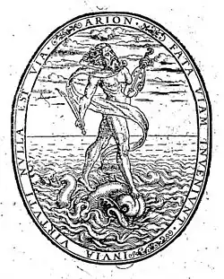 Looking at title page or at the colophon of an Oporinus edition, the printer's device shows the mythological lyre player Arion of Lesbos, which is supported by a Dolphin on the sea. There are more variant forms of it, some are shown below.
