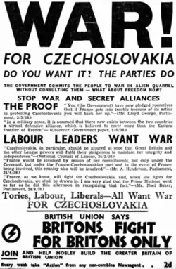 Throughout the British Empire pacifists were jailed for expressing antiwar sentiment.[8] Also Oswald Mosley and his British Union of Fascists were opposed to war, believing that another world war against Germany was not in Britain's national interest and that Britons should "fight for Britain alone".[9] Editorials and cartoons in Action often asserted that the British Empire needed to prepare for a defensive war against Japan and that war with Germany would put Britain's interests in Asia in jeopardy. Mosley devoted all of the party's efforts to the "Peace Campaign", calling for a referendum on the continuation of the war and advocating a negotiated peace treaty with Germany. The campaign ended after Mosley and many other senior BUF members were interned under Defence Regulation 18B in May 1940.[10]