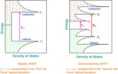 - The energies between the Van Hove singularities depend on the nanotube structure. Thus by varying this structure, one can tune the optoelectronic properties of carbon nanotube. Such fine tuning has been experimentally demonstrated using UV illumination of polymer-dispersed CNTs.[20]
