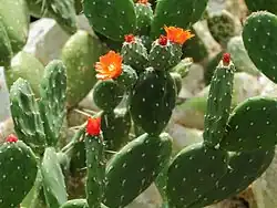 From the areoles emerging brown glochids, 2 to 4 millimeters long, with 2 to 7 spines that are sometimes missing, like needles and on the top a few beards. They are yellowish white, flattened at the top of 0.5 to 8 centimeters. The unisex flowers are orange-red to yellow-orange, 2.3-7 centimeters long and have diameters of 1-2.5 centimeters. The fruits are barrel-shaped, brown-green in color and are ripen reddish, 2.5 to 4 cm long and 2 to 4 cm in diameter. They are adorned with glochids and sometimes thorns or bristles.