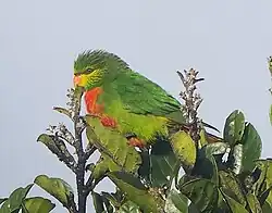 The orange-billed lorikeet (Neopsittacus pullicauda) is a species in the Old World parrot family Psittaculidae. First described by the German ornithologist Ernst Hartert in 1896, it is endemic to New Guinea, where it mainly inhabits cloud forest, forest edges, and cleared areas bordering forests at elevations of 2,100–3,800 m (6,900–12,500 ft). Adults are 18 cm (7.1 in) long on average and weigh 25–40 g (0.88–1.41 oz), and are mainly green in color, with a red underside and narrow yellow streaking on the cheeks. It looks similar to the closely related yellow-billed lorikeet, but is smaller in size, has more richly coloured plumage, and has a smaller, orange bill.