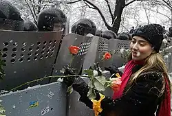 The Orange Revolution (Ukrainian: Помаранчева революція, romanized: Pomarancheva revoliutsiia) was a series of protests that led to political upheaval in Ukraine from late November 2004 to January 2005. It gained momentum primarily due to the initiative of the general population,[7] sparked by the aftermath of the 2004 Ukrainian presidential election run-off which was claimed to be marred by massive corruption, voter intimidation and electoral fraud.[8] Kyiv, the Ukrainian capital, was the focal point of the movement's campaign of civil resistance, with thousands of protesters demonstrating daily.[9] Nationwide,[10] this was highlighted by a series of acts of civil disobedience, sit-ins, and general strikes organized by the opposition movement.