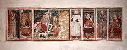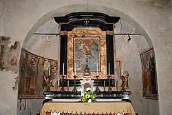 ![]() | Blessed Peter Lombard with Saint Nicholas of Tolentino | In the 15th century in the Novara area, the subject of the local Peter Lombard, known as the Master of the Sentences, often recurred. Antonio Massara appreciated its workmanship, describing its details: a figure with a mitre adorned with pearls and an orange cope under which the beautiful folds of the alb unfold. The hands, wearing white chiroteche with rings on the fingers, hold the pastoral staff in the left, and three books and a pen in the right to demonstrate his great doctrine. A halo of golden rays surrounds his head. Massara himself, while scraping away the plaster, discovered an inscription on the fresco relating to the patronage: Stefanina de Prolis et Iacobinus eius filius fecerunt fieri hanc figuram.[20] |