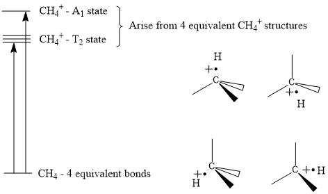 Two distinct states for CH4+ exist (A1 and T2), both of which result from the ionization of CH4. This gives rise to the two unique peaks on the photoelectron spectrum of methane.
