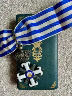 The Order of San Marino or Civil and Military Equestrian Order of Saint Marinus (Italian: Ordine Equestre Civile e Militare di San Marino) is an Order of Merit of San Marino. Established 13 August 1859, the order is presented for outstanding civil or military services to the Republic, or for humanitarian, artistic, political or scientific accomplishment.[2] It is only ever awarded to people who are not citizens of the Republic of San Marino.