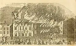 In 1841, the Augustinians purchased a farm which would become the site of Villanova University, one of the order's most prominent American apostolates. Three years later, on May 6, 1844, anti-Catholic mobs burned St. Augustine to the ground during the Philadelphia nativist riots.[6][1] A new church was completed by November 1848 and consecrated by Francis Kenrick.[1] Between 1844 and 1874, the friars of the order took on additional parishes and apostolates in the Archdiocese of Philadelphia, Diocese of Albany, Archdiocese of Hartford, Diocese of Ogdensburg, and Archdiocese of Boston.[1] In 1874 the province was renamed after Thomas of Villanova.[1] The province expanded into Cuba in 1899 when it founded what would become the Universidad Católica de Santo Tomás de Villanueva before the Augustinians were expelled in 1961 by Fidel Castro.[7][1] Augustinian ventures into higher education continued with the founding of Merrimack College in Massachusets in 1947.[1]