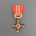 ![]()  |  ![]()  |  ![]()  |  The Cross of Liberty, 2nd Class with swords is similar in appearance to the Grand Cross with swords but measures 40 mm in height and width. When awarded for wartime merits, it is worn on the chest on a 31 mm wide red ribbon with a rosette, featuring a 1.5 mm wide white stripe 1 mm from each edge. For peacetime merits, it is worn on a 31 mm wide yellow ribbon, which has a 1.5 mm wide red stripe 1 mm from each edge. The Cross of Liberty, 2nd Class without swords is identical to the version with swords but features a wreath design similar to that of the Grand Cross awarded without swords.[2]   | ||