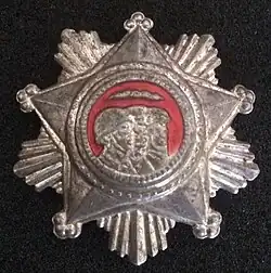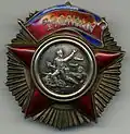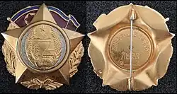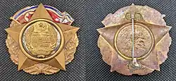 ![]() | Commemorative Order "Foundation of the Democratic People's Republic of Korea" 조선민주주의인민공화국창건기념훈장 Chosŏn Minjujuŭi Inmin Konghwaguk Ch'anggŏn Kinyŏm Hunjang | 1978 | This commemorative order was issued on the 30th and 40th anniversaries of the foundation of the DPRK. It was only awarded a maximum of twice to a single recipient. The obverse of this order is identical to the 20th Anniversary Commemorative Order but is not dated on the reverse. |