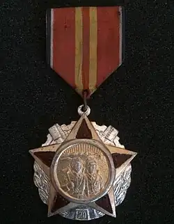 ![]() | Commemorative Order "20th Anniversary of the Foundation of the Democratic People's Republic of Korea" 조선민주주의인민공화국창건20주년기념훈장 Chosŏn Minjujuŭi Inmin Konghwaguk Ch'anggŏn Isip Chunyŏn Ginyŏm Hunjang | 1968-05-24 | This order was awarded only once per recipient and dated 1968.9.9. on the reverse. Awarded to people who helped found the DPRK in 1948 as well as those who contributed to national defense, development and progress in the past 20 years. |