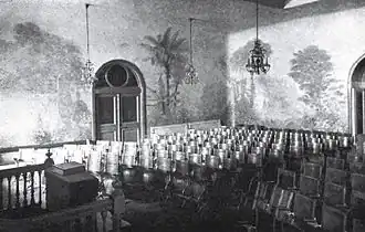 Of all the rooms in the Salt Lake Temple, this circular room is "by far the most beautiful" with "splendid simplicity rather than of sumptuous splendor".[6] Its ceiling is domed and fitted with circular and semi-circular windows. Its doorway "corresponds to the inner curtain or veil that shielded from public view the most sacred precincts" of earlier temples. Opposite the doorway is a large stained glass window depicting Joseph Smith's First Vision. The room has an altar, chairs and sofas. The Holy of Holies "is reserved for the higher ordinances in the priesthood relating to the exaltation of both the living and the dead."[7] In temples without a Holy of Holies these ordinances are administered in one of the Sealing Rooms, which is dedicated as a temporary Holy of Holies.