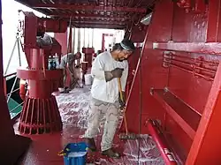 | Sweep and wash deck.[3] Excess water and salt on deck can lead to slipping hazards as well as accelerated rusting of the deck and equipment affixed to it. Ordinary seamen often bear the brunt of the swabbing duties, and many look forward to earning their able seaman's ticket and being done with swabbing. | |