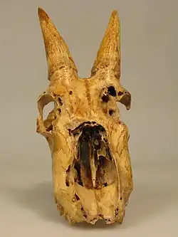 Harrington's mountain goat was first described in the 1930s by paleontologist Chester Stock.[2] Stock based his initial description on finds of skull fragments and metapodial bones from Smith Creek Cave in the Great Basin of Nevada.[2] In 1937 he authored a Bulletin of the Southern California Academy of Sciences article titled "A new mountain goat from the Quaternary of Smith Creek Cave, Nevada".[3] Later finds in Mexico, Colorado, Nevada, Utah, New Mexico, and the Grand Canyon have included intact skulls, metapodials, keratinous horn sheaths, dung, hair, muscle and ligament.[2][4]