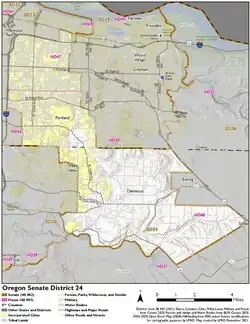 District 24 of the Oregon State Senate comprises parts of Clackamas and Multnomah counties. Since January 2021, it has been represented by Democrat Kayse Jama, who was appointed unanimously by the Clackamas and Multnomah County Boards of Commissioners to replace Shemia Fagan after she was elected Oregon Secretary of State.
