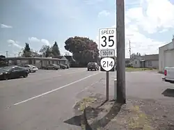OR 214's northern terminus is at the junction with Interstate 5 and OR 219 in the city of Woodburn. (A single diamond interchange serves both OR 219 and OR 214 from the freeway; OR 219 leads west of the interchange and OR 214 heads east). The roadway heads due east into the city of Woodburn for about 2.5 miles (4.0 km), skirting the northern edge of town (though passing through a very busy shopping district). It then intersects with both OR 99E and OR 211; OR 214 continues south from this intersection, sharing an alignment with OR 99E for 1.2 miles (1.9 km), officially along the Pacific Highway East No. 1E. OR 214 then departs from OR 99E and heads southeast.