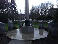 The memorial features seven granite pillars on each side of the Oregon State Capitol. East of the building, the pillars surround a flagpole with the American flag, and on the opposite side, the pillars encompass a flagpole with the state flag. Thirteen pillars have a bronze plaque depicting one of thirteen Medal of Honor recipients from Oregon; the fourteenth one lists the names of medal recipients with a connection to the state, but who did not enlist in Oregon.[2] Bob Maxwell's name appears on the fourteenth pillar.[3]