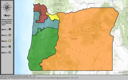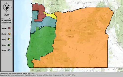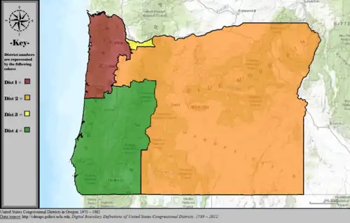 Table of United States congressional district boundary maps in the State of Oregon, presented chronologically.[4] All redistricting events that took place in Oregon between 1973 and 2013 are shown.