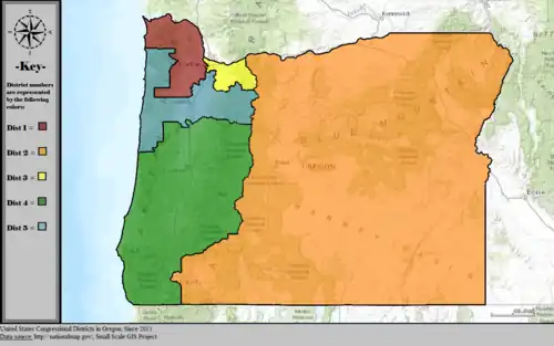 The U.S. state of Oregon has had six United States congressional districts since 2023, when the 6th district was created as a result of the 2020 census.[1] The 5th district was added as a result of the 1980 census, and boundaries were redrawn following the population changes to each district, as determined by the 1990, 2000, 2010, and 2020 censuses.