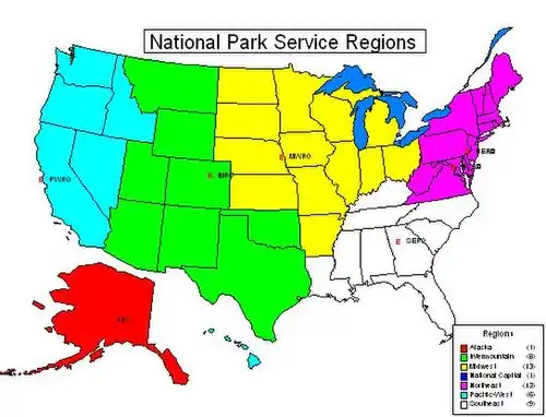The NPS has twelve administrative regions.[4] Each region provides oversight and guidance to the park units within its geographic area. They were established in 2018 following a Department of Interior-wide reorganization that created unified regions for all of the departments' bureaus.[5] The NPS formerly had seven administrative regions.