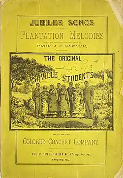 The Original Nashville Students, also referred to as the Original Tennessee Jubilee and Plantation Singers, the Nashville Students, and H. B. Thearle's Nashville Students, were an ensemble of eight or nine African-American jubilee singers. The moniker “jubilee singer” was coined by George White for his a cappella group The Fisk Jubilee Singers. This was primarily a reference to the Jewish year of jubilee described in Leviticus 25.[1] Additionally, jubilation elicits connections with emancipation and liberation, drawing on emotions of nationalist pride from both African American and white audiences. Adopting this title allowed the singers to brand themselves as those who were formerly enslaved, but who had triumphantly risen out of their oppression.