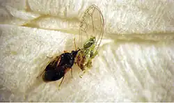 O. minutus females overwinter fertilized, usually emerging from hibernation in the early spring.[1][8][9] Males can hibernate but are unlikely to survive the winter due to their lack of diapause and inadequate lipid accumulation.[1][10] Shortly after hibernation ends, eggs are deposited onto the base of developing flower buds or the midrib on the bottom of leaves.[1][11]