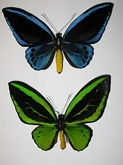 In males, iridescent areas of the wing are typically green, although some subspecies endemic to island groups east of New Guinea have blue males. These subspecies are O. p. urvilleanus (New Ireland, Bougainville, and Solomon Islands), O. p. miokensis (Mioko Island), and O. p. caelestis (Louisiade Archipelago).[4]