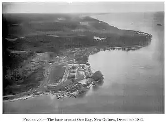 During World War II, Oro Bay was used as staging area, the terminus for convoys of Operation Lilliput, for the battle of Buna-Gona and future operations. A United States advanced base was constructed at Oro Bay, with a liberty ship wharf at the southern end of the bay, installations along the shore, and anti-aircraft gun batteries in the surrounding hills.[2] On 28 March 1943, Imperial Japanese planes attacked shipping and harbour facilities at Oro Bay, resulting in the sinking of SS Masaya and SS Bantam. Oro Bay Airfield was also located near here.