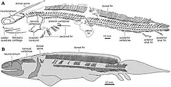 Orthacanthus is an extinct genus of fresh-water xenacanthiform cartilaginous fish, named by Louis Agassiz in 1843,[3][4] ranging from the Upper Carboniferous[3] into the Lower Permian.[1] Orthacanthus had a nektobenthic life habitat, with a carnivorous diet.[5] Multiple authors have also discovered evidence of cannibalism in the diet of Orthacanthus and of "filial cannibalism" where adult Orthacanthus preyed upon juvenile Orthacanthus.[6] Synonyms of the genus Orthacanthus are Dittodus Owen, 1867, Didymodus Cope, 1883, Diplodus Agassiz, 1843,[5] Chilodus Giebel, 1848 (preoccupied by Chilodus Müller & Troschel, 1844).[3]